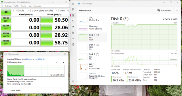 سلام دوستان و اساتید محترم من حدودا دو ماهی میشه این ssd رو از لیون خریدم از همون روز اول نکته ای که نظرمو جلب کرد این بود دمای این درایو روی 40 درجه گیر کرده بود همچنان هم گیر کرده روی اون دما مشخصه دمای واقعی رو نشون نمیده. الان ولی مشکل دیگه ای رو پیدا کردم اونم اینه که موقع کپی کردن هر فایلی چه حجیم چه غیر حجیم داخل این ssd چه از هارد داخلش کپی بشه چه از m.2 اول سرعتش درسته ولی بعد بیست دقیقه سرعت نوشتنش میشه 40 مگ که من این مورد رو با تست کریستال مارک هم تست کردم به همین نتیجه رسیدم که سرعتش بالاتر از 40 نمیره انگار که داغ میکنه تراتل میکنه یا مشکل دیگه نمیدونم واقعا. فقط و فقط هم سرعت نوشتنش ایراد داره سرعت خوندن اصلا مشکلی نداره. کابل ssd هم جنس خوده ایسوس بود که وصله (به ساتای شماره یک) که به نظر با کیفیت میاد فکر نکنم از کابل باشه چون تا بیست دقیقه اول کپی سرعتش بالاست به سرعت اسمی خودش که 450 مگابایته میرسه بعد کم میشه یهو. اگر اطلاعاتی دارید یاری برسونید سیستم هم core i 5 12400f asus b660 pluse d4 8gb ram ddr4 3200