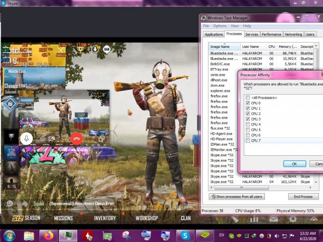 ببین مشکلی که الان داری مربوط میشه به سرعت پردازندت نه قدرت پردازشیش وقتی نرم افزار MSI AfterBuner اجرا میکنی میبینی که نهایتا داری از 30% قدرت سی پی یوت استفاده میکنی اما سرعت سی پی یوت خیلی پایینه و دلیل کاهش فریمت همین سرعت پایینه و به قدرت پردازشی سی پی یوت مربوط نمیشه گزینه CPU clock رو هم تو نرم افزار MSI AfterBurner تیک بزن که در حین بازی بتونی بصورت لحظه ای سرعت کلی سی پی یو هم ببینی من خودم این مشکلو با بازی پابجی که اونم مثل بازی شما آنلاینه تو نرم افزار Gameloop داشتم . کلا بازیهای آنلاین با تعداد بالا نیاز به سرعت پردازنده دارن . مثلا پابجی نسخه شبیه ساز تو لینک رسمیش گفته سی پی یو دو هسته ای میخواد با سرعت حداقل 3 گیگاهرتز ولی برای من چهار هسته ایه با سرعت 2.8 اما هیچوقت روی 2.8 نمیره مگر اینکه یه حرکتی روی سی پی یو بزنم که در ادامه میگم اون حرکت چیه برای حل این مشکل رفتم تو لینک سایت سی پی یوم دیدم موقعی که سی پی یو از چهار تا هسته استفاده میکنه سرعت میاد روی 1.7 اما وقتی از دوتا هسته استفاده میکنه میاد 2.4 و موقعی که میره رو یک هسته تا 2.8 هم سرعت میره بالا طبق عکس زیر بعد کاری که کردم این بود که رفتم داخل Task Manager و با استفاده از گزینه Set Affinity تعیین کردم که فایل اجرایی بازی یعنی Gameloop.exe فقط با چهارتا از تردها (Thread) که میشه دوتا هسته (هر دوتا ترد یک هسته برای سی پی یو هایی که قابلیت هایپر تردینگ دارن) کار کنه و همین عمل باعث شد سرعت سی پی یو بره روی 2.4 گیگا هرتز و دیگه کاهش فریم شدید که فریم بره روی چهار ده پونزده نداشته باشم و کمترین افت فریم به 25 تا 30 برسه و بتونم بازی کنم . فکر کنم سی پی یو شما که i5 هستش قابلیت هایپر تردینگ نداشته باشه که هر دوتا ترد یک هسته باشه و احتمالا هر ترد برای خودش یه هسته است فقط دوتا نکته در موردی کاری که انجام دادم بگم نکته اول اینکه بجز گیم لوپ بقیه نرم افزارارو کامل بستم تا هیچ نرم افزاری روی ترد های 4 تا 7 بار پردازشی ایجاد نکنه (حتی یک درصد) تا سی پی یو سرعتش بصورت لحظه ای بیاد روی 1.7 گیگا هرتزی که تو سایت سی پی یو گفته بود و لگ ایجاد بشه . منظورم حالتیه که سی پی یو تمام هسته هاش فعاله و سرعت میاد روی 1.7 گیگا هرتز هرچند تو میتونی بصورت لحظه ای با نرم افزار MSI AfterBurner ببینی که موقع بازی سرعتت چنده و اینکه کارو درست انجام دادی یا نه . اگرم نرم افزاری بود که نمیشد ببندیش و لازم بود در کنار بازی اجرا بشه پس بهتره اونم تنظیم کنی رو همون تعداد هسته ای که برای فایل اجرایی بازیت تنظیم میکنی تا باعث کاهش سرعت پردازنده نشه نکته دوم اینکه وقتی من با استفاده از Set Affinity بار پردازشیو روی دوتا از ترد ها (یک هسته) متمرکز میکنم با اینکه سرعت اومد روی 2.8 و بصورت ثابت قفل شد اما واقعا دوتا ترد قدرت پردازش کامل بازیو نداشت چون سی پی یو من با اینکه Core i7 هستش ولی ضعیفه . واقعیتش انتظارم نداشتم بازی برام با یک هسته خیلی روان اجرا بشه چونکه پردازنده من نسل اول سری سی پی یو های Core i ولی برای شما نسل هشته (i5 8250U) که خب قدرت هر هسته سی پی یو شما سه چهار برابر قدرت هر هسته سی پی یو منه ولی باز خودت باید تمام گزینه هارو تست کنی ببینی رو کدوم حالت بهترین نتیجه رو میگیری . شما ماکسیمم سرعت سی پی یوت 3.4 گیگا هرتزه که فکر کنم فقط روی تک هسته فعال میشه ولی بعید میدونم با یک هسته بتونی بازیو با FPS خوب اجرا کنی احتمالا باید بری روی دو هسته تا قدرت و سرعت رو در کنار هم داشته باشی اگر روش بالا جواب نداد باید یا از توی بایوس نیمی از هسته هاتو غیر فعال کنی یا اینکه بار پردازشی همه پردازش هارو با استفاده از Affinity بزاری روی نصف هسته ها یا یک هسته تا به سرعت مورد نظر برسی این کلیپو ببین بد نیست . توش یه روشی گفته که از تو ویندوز بخش msConfig هم میتونی هسته هارو غیر فعال کنی ولی اون کارایی غیر فعال کردن از داخل بایوس رو فکر نکنم داشته باشه . برا من که نداشت و با فعال کردن دوتا ترد از msConfig و فشار حداکثری رو تردها سرعت پردازنده از روی 1.7 تکون نخورد . با نرم افزار CPU-Z هم میت