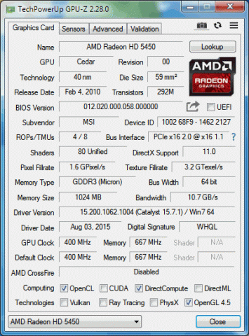 سلام، گرافیک زیر کاملا سالمه، گارانتی تموم شده و جعبه و متعلقات نداره. https://www.msi.com/Graphics-card/R5450-MD1GD3HLP قیمت : 170 هزار تومان فقط جهت اطلاع و کنجکاوی دوستان باید بگم بنا به دلیلی نامعلوم (شاید قدیمی بودن درایور یا سیستم ضعیفی که کارت رو روش تست کردم) تو تست furmark یا هر عملیات گرافیکی دیگه میزان لود gpu رو نرم افزار gpu-z یا حتی بخش مانیتورینگ داخل AMD Catalyst Control Center صفر نشون میده (تو عکس مشخصه) در حالی که اون عملیات گرافیکی راحت انجام میشه.