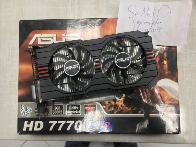 13. درود و عرض ادب قصد فروش کارت گرافیک ASUS HD 7770 2GB رو دارم . کارت دارای کارتن و متعلقات است و باز یا تعمیر نشده. مقداری دمای کارت بالاست که بنده ترجیح دادم کارت برای تعویض خمیر باز نشه. ضمن اینکه دمای خیلی بالایی نیست و فن ها هم هیچ نویزی ندارند. نیاز به یک عدد کانکتور ۶ پین داره. فروخته شد گام مزایده ۲۵ و پایان مزایده ۲۴ ساعت بعد از اخرین پیشنهاد