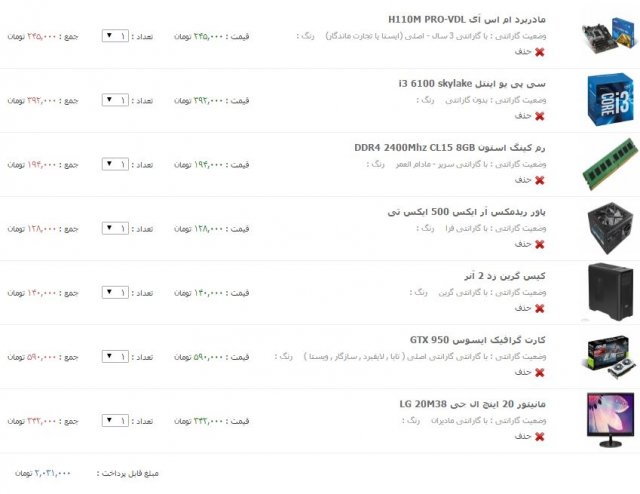 6. مانیتور و کیس دارین؟ مشخصاتشو بدین اگه قابل استفاده باشه در هزینه هاتون صرفه جویی میشه motherboard: h110 cpu: i3 ram: 8gig or 16gig vga:gtx950 power:500watt