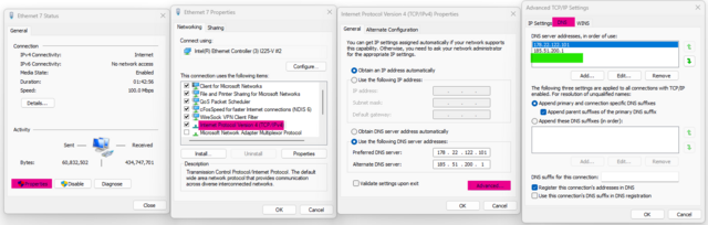 سلام اینجور مشکلات بیشتر بخاطر شبکه شخصی انتقال داده هست تا isp و غیره... بعضی شبکه شخصی انتقال داده ها مثل warp تو تنظیمات DNS یه ایپی سوم ایجاد میکنن که باعث ایجاد اینجور مشکلات میشن. به ترتیب تصویر زیر برید تو تنظیمات DNS کانکشن و DNS سوم رو حذف کنید. یا کلا DNS رو روی شکن تنظیم کنید : DNS: 178.22.122.100 – 185.51.200.2 اگر حل نشد کلا یه نتورک ریست بزنید به احتمال زیاد درست میشه. ضمنا پیشنهاد میشه هر نرم افزار فیلتر شکنی که داخل Startup apps هست رو غیر فعال کنید.- 24 ارسال