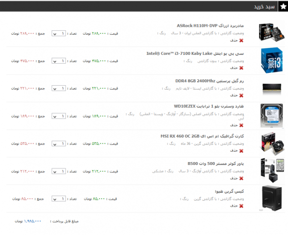 1. http://lioncomputer.ir/product/10721/سی+پی+یو+اینتل+Intel+i3-7100+Kaby+Lake/ http://lioncomputer.ir/product/10204/کارت+گرافیک+ام+اس+آی+RX+480+ARMOR+OC+8GB/#prettyPhoto چهل تومن بیشتره از بودجتون ولی ارزشش رو داره البته سی پی یو یکمی تو بازی های سی پی یو محور گلوگاه میشه که زیاد به نظرم مهم نیست نمیدونم چرا با وجود 7100 دوستان بازم 6100 رو پیشنهاد میدن (نسل جدیدتر و قوی تر )