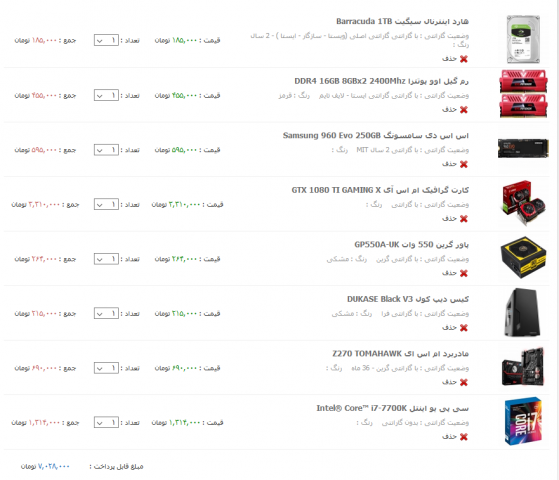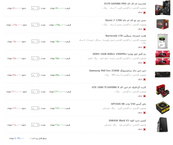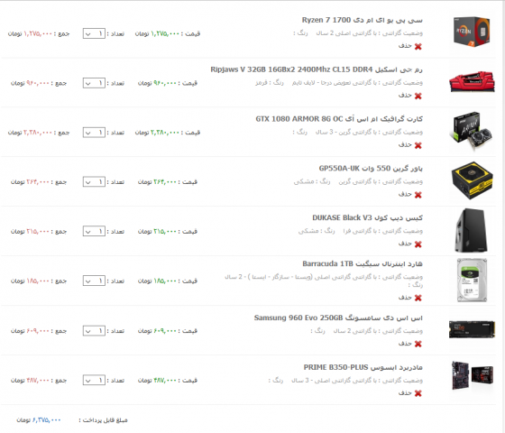 با سلام. کلا کاری ندارم به اینکه با یه پاور550 وات مناسب میشه 2 تا 1070 رو sli کرد و خوب 1080ti خیلی کم مصرف تر هستش. فقط شما یه بار بودجه ایشون رو در نظر بگیرید. مشاوره در خرید سیستم گیمینگ تا سقف 7 میلیون شما یه سیستم پیشنهاد دادید با بودجه 8230 .......................................................................................................................................................................... استارتر عزیز اگه قصد خرید سیستم پیشنهادی دوم بنده رو داشتید اگر اور نمیکنید میتونید یه کولر ساده تهیه کنید وگرنه به یک واتر کولر با کیفیت نیاز دارید. موفق باشید. -
