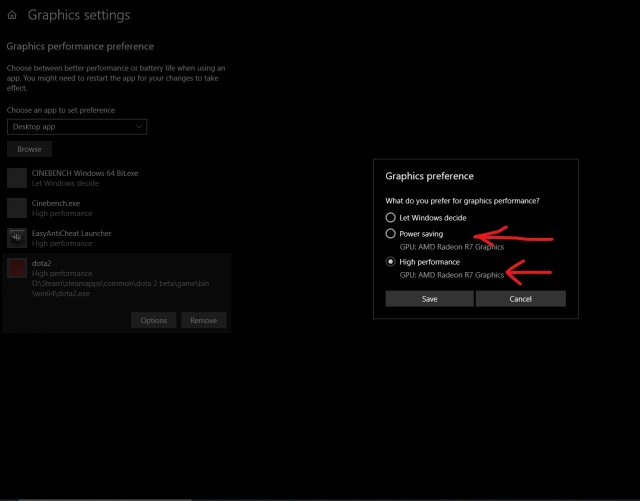 سلام و درود خدمت شما دوست عزیز خدارشکر چون از ویندوز 10 استفاده میکنید برای مجزا سازی گرافیک ها کارتون خیلی راحته البته توی ویندوز 7 هم این قابلیت وجود داره ولی یکم دردسر درابوری وجود داره بگذریم برای اینکار 1. اپدتا اول بروی دستکتاپ کلیک راست و گزینه Display Settings انتخاب میکنیم 2. سپس در صفحه جدید باز شده اسکرول کنید تا به اخر صفحه برید و گزینه Graphics Settings انتخاب کنید 3. سپس در صفحه جدید باز شده از گزینه Browse برنامه هایی که میخوایید با گرافیک های مجزا استفاده کنید انتخاب کنید پس از انتخاب برنامه ها ایکن و تصویر برنامه در زیر نمایش داده میشود 4. سپس برای مشخص نمودن اینکه کدام برنامه با کدام گرافیک اجرا شود بروی برنامه مورد نظر کلیک کنید و گزینه Options کلیک نمایید 5. سپس در صفحه جدید باز شده بر اساس نوع قدرت گرافیک و تعداد گرافیک های موجود بروی سیستم چندین گزینه خواهید دید که اسم هر گرافیک در زیر ان نوشته شده است و با انتخاب ان گزینه ویندوز برای ان برنامه فقط از همان گرافیک استفاده میکند نکته : در ویندوز 10 متاسفانه یک باگ نرم افزاری وجود دارد که بعضی اوقات همه گرافیک هارو نمایش نمیدهد و فقط بر اساس قدرت گرافیک میشود حدس زد که منظرو از گزینه Power saving و high performance کدام گزینه منظورش کدام گرافیک میباشد به عنوان مثلا لبتاپ بنده دارای دو عدد گرافیک (اصلی :RX 460 4GB و انبرد :R7 radeom میباشد ) اما در این عکس برای هر دو گزینه فقط شما اسمه گرافیک R7 را میبینید اما این غلط است برای اینکه شما بفهمید که ویندوز از کدام گرافیک برای اجرای برنامه استفاده میکند ابتدا مانند عکس زیر برای برنامه مذکور یکی از گرافیک هارو انتخاب کرده و سپس با باز کردن تسک منیجر و زیر نظر گرفتن میزان فعالیت گرافیک ها در برنامه های مورد نظرتون بعد انتخاب و تنظیمشون میتونید بفهمید ویندوز از کدام گرافیک استفاده میکند- 2 ارسال