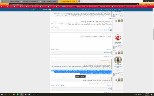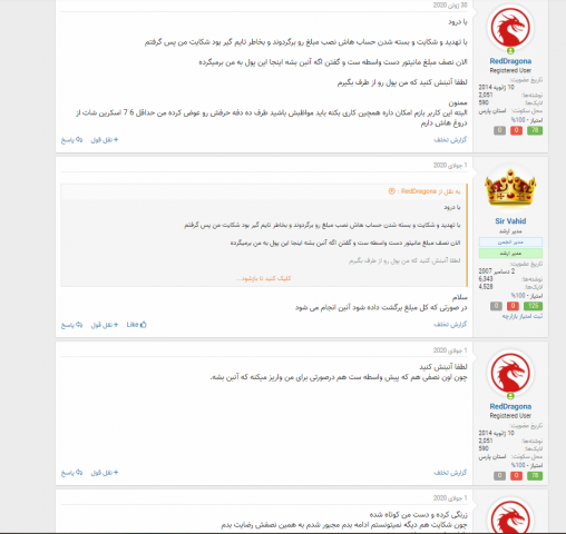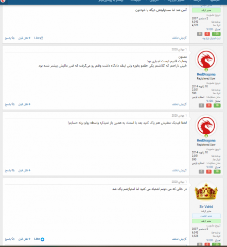 چقد یه آدم میتونه پررو باشه!! دروغ گویی تا کجا!! من لات بازی در آوردم یا شما؟!! اسکرین شات بفرستید وحشی گری؟!! هیچ بد و بی راهی نگفتید نه؟! دروغ راحت شده که موضوع رو دارید 180 درجع برمیگردونید! شما تو همین تاپیک بیشتر از 10 تا توهین زشت به من کردید بعد به همه دوستان میگید اصلا توهین نکردید!! خیلی عالی هستید شما مظلوم نمایی و داستان سرایی من فرصت دفاع از حقتون رو ندادم؟ من پیام دادم تو واتسپ گفتید به شما ربطی نداره و منو بلاک کردید تو پی تی شکایت کردم تا 2 روز جواب ندادید بعد اومدید گفتید کارگر ساختمونی هستید و داشتید پول حلال در میاوردید (عین کلمات ایشون) و بعد بخاطر مغلطه و حاشیه رفتن ادمین تهدید به بن شما کرد و شما تست سلامت جعلی دادید که باعث شد درجا بن بشید نصف پول رو قبول کردید که بن نشید منم بخاطر احترام به آقا حامد که خودم واسطه کرده بودم نصف پول رو قبول کردم وگرنه عملا کلاه برداری کرده بودید و حقم خورده شده بود نمیخواستم کوتاه بیام- 76 ارسال