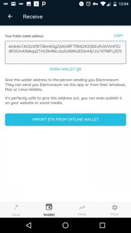 1- به آدرس زیر برید و یک اکانت درست کنید https://my.electroneum.com/login 2- از پلی استور اپ رو دانلود کنید 3- پس از نصب با اکانت قسمت یک وارد شوید از شما مشخصات اکانت و پین کدی که در موقع ثبت نام وارد کردید خواسته می شود 4- به قسمت والت بروید 5- recive 6- import etn from offline wallet 7- scan QR به ترتیب Public sercret veiw secret spend 8- confirm and import نیازی به ساخت کیف پول جدید نیست از همون پیپر والت می تونید استفاده کنید اپ بهتره چون میتونید راحت QR اسکن کنید