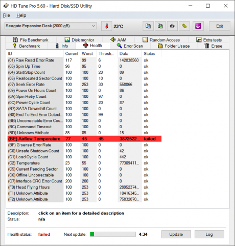 6. درود یک عدد هارد آداپتوری سیگیت اکسپنشن ظرفیت 2TB به فروش میرسد گارانتی تموم شده، استفاده هارد فقط آرشیو بوده و مدت زمان کارکردش فقط 86 ساعت هست هارد کاملا سالمه، فقط تست HDTune رو هم جهت صداقت با خریدار گذاشتم که Health رو Failed گزارش کرده که مشاهده میفرمایید فقط به این دلیل هست که هارد یکبار زمانی که با دیتا پر شده به دلیل بی دقتی یه بنده خدایی دماش به 55 رسیده که حد دمای بالای فرض شده توسط این نرم افزار هست. در هر صورت HD Sentinel و تست بدسکتورهای HDTune گواه سلامتی کامل هارد هستن هارد به خاطر جبران افت قیمتش فقط با دیتای انتخابی به فروش میرسه که لیست با فرمت اکسل ازین آدرس قابل دانلود هست، پس فقط به درد کسایی میخوره که دیتا بخوان دیتا هم شامل 15 ترا از بهترین عناوین حجم بالای سینما و تلویزیون بوده که عمدتا از انکودرهای حرفه ای ترکرهای خصوصی دانلود شده و کاملا منظم و مرتب هستش و کمتر جایی مشابهش رو پیدا میکنید قیمت فروش هم با احتساب 2 ترا دیتای انتخابی 360 تومن