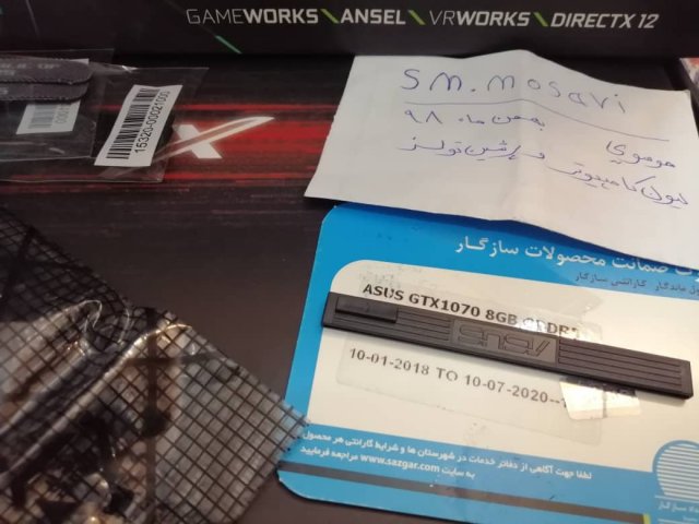 11. سلام خدمت دوستان عزیز لیونی با فروش یک عدد کارت گرافیک ASUS ROG Strix GeForce GTX 1070 OC عروسک بسیار تمییز و در حد با کاربری گیم و بدون هیچ گونه ماین و کول واین و.. در خدمتتون هستم. جعبه و متعلقات کامل و موجود . کارت تا برج 7 /2020 گارانتی سازگار داره . تاکید می کنم کارت مصرف فقط گیم داشته و بدون هیچ گونه اوری میباشد. مدل OC . قیمت مقطوع بدون ذره ای تخفیف 3650 تعویض فقط با مانیتور ASUS MX279H AH-IPS 27inch Monitor - حضوری شهر قم - اول واریز بعد ارسال - هزینه ارسال با خریدار - قیمت مقطوع https://forum.persiantools.com/threads/فروش-مانیتور-vx239-asus-و-یک-عدد-کارت-گرافیک-asus-rog-strix-gtx-1070-oc.955591/