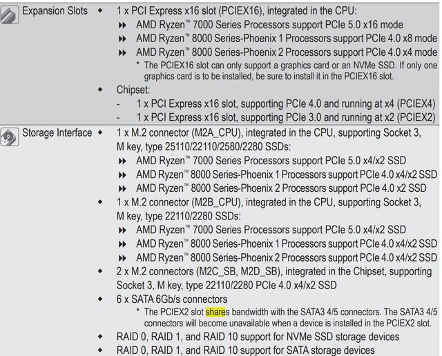 این مادربرد 2 اسلات M2A و M2B مستقیم به cpu وصلن و تا PCIe 5.0 x4 ساپورت میکنن اگ هر دو اسلات وصل باشن پهنای باند میشه PCIe 5.0 x2 یا همون PCIe 4.0 x4 پس بهتره یا ی دونه ssd نسل 5 ببندی یا دو تا نسل 4 و 2 اسلات M2C_SB، M2D_SB ب چیپست وصلن و تا PCIe 4.0 x4/x2 ساپورت میکنن پس بهتره یا یک ssd نسل 4 یا دو تا نسل 3 ببندی تا پهنای باند هدر نره ولی طبق دفترچه مادربرد هر 4 اسلات رو هم اگ پر کنی تاثیری روی لاین های گرافیک نداره -