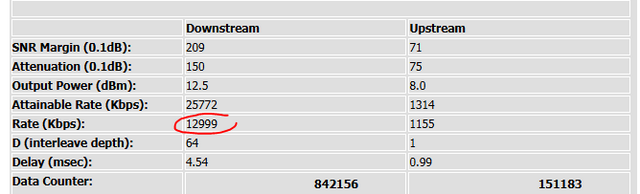 خب مشکل رو پیدا کردم و حلش کردم؛ الان جزئیات مودم به صورت زیر هستش، قبلا اون مقدار قرمز رنگ 4000 بود، الان 13000، فک کنم همین گزینه بود، دقیقا خاطرم نی؛ کابل جدید گرفتم، وصل کردم دیدم همون مشکل است، کابل رو از مسیرهای مختلفی عبور دادم، کنار برق و آنتن تلوزیون هر چیز دیگه ای نباشه همه جوره تست کردم، بعضی وقتا درست میشد بعضی وقتا خراب، آخر سر فهمیدم مشکل از اون پریز-نری هستش که کابل بهش وصل میشه و اون پریز-نری هم به جلوی در خونه وصل میشه؛ الان یه [جعبه تقسیم روکار] گرفتم، (جلو بارون و آفتاب و اینجور چیزا رو میگیره تا بارون بهش نخوره و زنگ نزنه دوباره، نمیدونم چقدر میتونه مفید باشه ولی خب حداقل بهونه رو ازم میگیره!)، و اون پریز نری و مادگی داخلش هستش ( محل اتصال کابل خونه به کابل بیرون )، پریز نری و مادگی رو هم عوض کردم، تا الان هیچ مشکلی رخ نداده برای اینترنت.