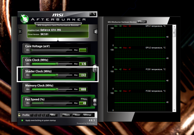 نرم افزار رو ببر روی این اسکین؛ ممکنه یکم بیشتر بتونی فرکانس بدی، اگه هم نشه حداقل میتونی فرکانس Shader رو بیشتر کنی. به غیر از این ببین فرکانس Memory رو تا چه حد میتونی ببری بالا؛ اول 50MHz ، 50MHz ببر بالا تا جایی که کرش بشه. بعد از اون کم کم فرکانس پایدار رو پیدا کن و دما رو هم همیشه چک کن. البته ریسک خراب شدن کارتت هم هست.