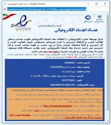5. با سلام و خسته نباشید دوستان بنده میخواستم وب سایت www.parsping.ir رو قیمت گذاری و واگذار کنم این کسب و کار رو با کلیه موارد از جمله هاست سایت خود فروشگاه سرور گروه تلگرامی و کلیه موارد رو واگذار میکنم همینطور در صورت نیاز آموزشهای لازم جهته ادامه ی فعالیت سایت رو هم خواهم داد تصویر نماد اعتماد الکترونیک سایت که مشخصات من رو نشون میده