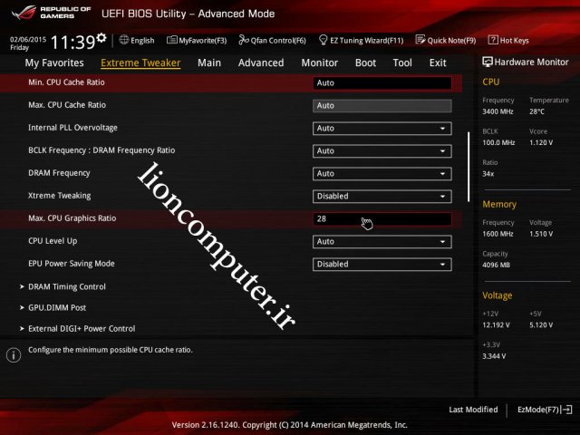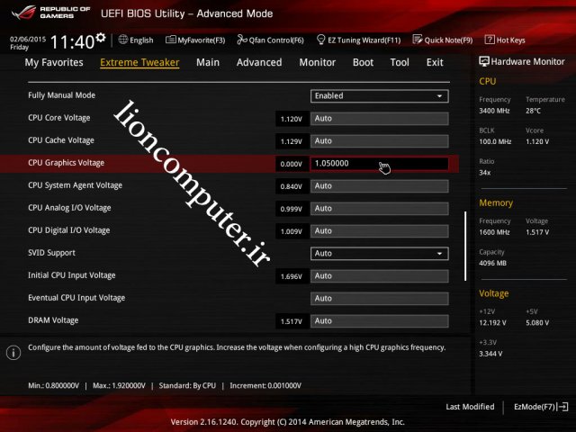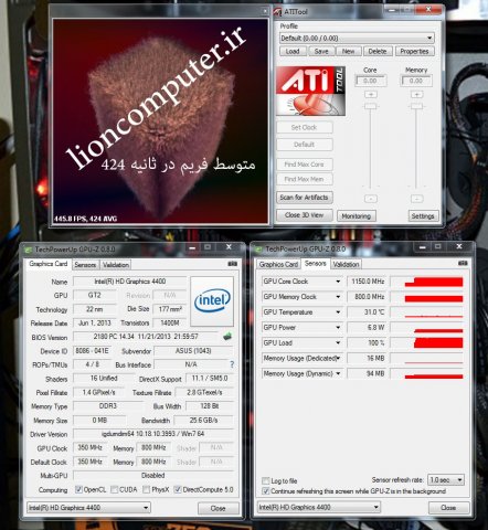 خوب دوستان میخام روش اورکلاک گرافیک آنبرد Intel HD 4400 رو خیلی ساده بیان کنم (چون خیلی ساده هست) این گرافیک تو سیپیو های ذیل در دسترس هست I3 4130 4150 4160 قبل از شروع ما 2 حالت اورکلاک جیپیو رو داریم که اول = استفاده 24/7 و روزانه هست (جهت گیم و ...) دوم = فقط جهت تست و ثبت ثابمیت ( که یعنی بالاترین فرکانس و ولتاژهایی که بسته به خنک کنندگی سیستم میتونه بالا و بالا تر بره ) خوب برای شروع به چند نرم افزار نیاز داریم برای تست پایداری که من به شخصه از این نرم افزارها استفاده میکنم اول از همه GPU z برای نمایش دما و فرکانس جیپیو و بعد یه نرم افزار کوچک و کم حجم برای تست پایداری که من از ATITool_0.27b4 استفاده میکنم که فقط 1.5 مگابایت حجم داره ولی در حد یه نرم افزار چند گیگابایتی گرافیک رو زیر فشار میبره خوبیه اصلیش اینه که خیلی سریع میشه فهمید که اورکلاک شما چقدر هست و چه مقدار به قدرت کلی کارت افزوده شده که اون رو با Avrage Frame به شما میگه که گرافیک مورد نظر ما تو این برنامه بدون اورکلاک عدد متوسط 424 رو میده که (این عدد با امتیاز گرافیک GT 730 یکی هست ) (بعد از اجرای تست بزارید حدود 10 تا 15 ثانیه ادامه پیدا کنه تا به بهترن فریم برسه) برای درک بهتر یه تست از بازی درایور سان فرانسیسکو هم میزارم که در بالاترین تنظیمات و تو فرکانس مرجع گرافیک تست شده که فریم 22.3 هست (در 1080) خوب اورکلاک رو با افزایش فرکانس جیپیو از داخل بایوس شروع میکنیم که من از حد اقل 1400 شروع میکنم در تصویر مشخص هست که باید Max.CPU Graphics Ratio رو بالا ببرید که در حالت پیش فرض 23 هست و با افزایش هر 1 عدد فرکانس گرافیک 50 مگاهرتز افزوده میشه که ما با قرار دادن بر روی 28 به فرکانس 1400 میرسیم که خوب در این جا باید ولتاژ پردازنده گرافیکی رو هم دستی وارد کنید ولتاژ پایه این گرافیک 1.050 هست که ما فعلا برای شروع همین عدد رو ست میکنیم خوب تنظیمات بایوس رو ذخیره میکنیم و به داخل ویندوز میایم جهت تست پایداری ابتدا Gpu z رو باز میکنیم و در تب سنسور نگاه میکنیم ببینیم موقع تست فرکانس تا چه عددی بالا میره و بعد تست ATI TOOL رو باز میکنیم که خوب تنیجه حدود 20 درصد افزایش کارایی رو نشون میده امتیاز از 424 به 519 افزایش پیدا کرد حالا باید با یک نرم افزار مثل 3dmark 03- 05- 06 - HWBOT Aquamark3 تست بزنیم ببینیم تو این فرکانس پایداری داره یا نه من نرم افزاره Aquamark 3 رو انتخاب میکنم چون تست خیلی کوتاه هست و تا 90 درصد میشه اطمینان حاصل کرد که فرکانس و ولتاژ کافی هست تست پاس شد و اسکور گرافیک 32568 هست بعد از اتمام تست با GPUz - Ati Tool تست کنید اگردیدید اسکور نرم افزار کم شده و فرکانس گرافیک به 1150 برگشته بدونید که ولتاژ رو کم دادید و باید از طریق بایوس افزایش بدید خوب بعد از پاس شدن تست ها در این ولتاژ و فرکانس به سراغ فرکانس 1500 میریم که همانند تست اول از داخله بایوس باید انجام بشه بعد از ست کردن فرکانس روی عدد 30 و ذخیره تنظیمات با همون ولتاژ قبلی به ویندوز وارد بشید و ببینید میتونید تو همون ولتاژ از گرافیک استفاده کنید یا خیر اگر نشد ولتاژ گرافیک رو 50 تا 50 تا بالا ببرید مثلا 1.050 رو بکنید 1.100 و تست پایداری بزنید با افزایش ولتاژ دمای گرافیک بالا میره و همچنین مصرف برق گرافیک (طبق گفته جیپیو زد افزایش پیدا میکنه) خوب بعد از تنظیم اعداد مورد نظر وقتی به داخل ویندوز رسیدید با استفاده از نرم افزاره Ati tool تست فریم و آرتیفکت بزنید اگر یک لحظه سیستم هنگ کرد و دوباره راه افتاد بدونید که به خاطره ولتاژ کم مادربورد فرکانس گرافیک رو به حات عادیش برگردونده و شما باید از داخل بایوس ولتاژ رو افزایش بدید و اگر تو نرم افزار ATI TOOl تو تست آرتیفکت با این حالت رو به رو شدید یعنی ولتاژ شما کم هست در این صورت به بایوس میرم و ولتاژ رو افزایش میدم از 1.050 به 1.100یا 1.150 تا 1.200 اگر بخام ولتاژ ها رو به 3 محدوده تقسیم کنیم مثلا سفید = امن زرد = احتیاط قرمز = خطر تا ولتاژ 1.200 شما در محدوده امن هستید که میشه گفت هیچ خطری تهدید کننده نیست من بعد از چند تست ولتاژ رو روی 1.150 ست کردم و تست ها رو انجام دادم