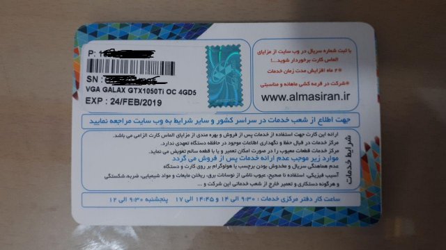 با سلام خدمت دوستان همونطور که از عنوان تاپیک پیداست یه کارت Galax gtx 1050ti برا فروش موجوده.کارت اکبند هست و هیچ استفاده ای نشده .تازه برام رسیده. کارت گارانتی الماس داره تا تاریخ 24 فوریه سال 2019. با توجه به اینکه تو بیشتر فروشگاه ها به قیمت 935 قیمت گذاشتن قیمت پایه:805 قیمت فوری850 گام افزایشی:10 محتویاتش کامله کم و کسری هم نداره.معامله با واسطه هم صورت میگیره.6 ساعت بعد از بالاترین پیشنهاد تقدیم میشه.مهلت تست هم داره ایدی تلگرام :https://t.me/yasinsayadinik شماره تلفن:09172343757 لینک محصول در لیون:کلیک کنید ارسال به سراسر کشور با پست و تیپاکس صورت میگره.هزینه ارسال بر عهده خریدار محترم خواهد بود. تصاویر:- 23 ارسال