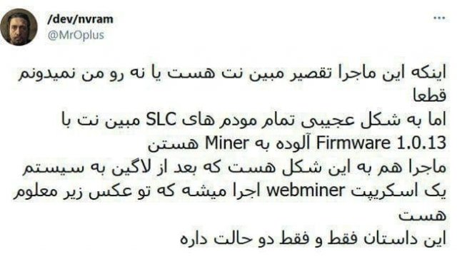 به به از عزیز دل، مبین نت 😐 ⚠️ تایید شد: مودمهای مبین نت بدون اطلاع کاربر بیت کوین ماین میکنند! 🔸 در یک اتفاق باور نکردنی مشخص شده برخی از مودمهای مبین نت به اسکریپت ماینینگ آلوده هستند و بدون اطلاع کاربر اقدام به استخراج رمزارز میکنند. این موضوع توسط یک توسعه دهنده ایرانی افشا شده و مبین نت آن را تأیید کرده است. منبع سورس ایران توسعه دهنده افشاکننده این موضوع راهکاری را برای حل موقت مشکل پیشنهاد داده است. او در حساب توییتر خود نوشت کسانی که از این نوع مودم ها استفاده می کنند می توانند در فایروال پورت 80 / 443 را برای شبکه بی سیم (WAN) ببندند. او همچنین گفت که که کاربران باید دسترسی TR069 را غیرفعال کرده و آی پی آپدیت سرور را نیز برای مودم ببندند. و در نهایت آدرس استخر استخراج را توسط route یا url filtering متوقف کنند. شرکت مبین نت هنوز جزئیات بیشتری درباره این موضوع و زمانبندی رفع آن منتشر نکرده است. در صورت انتشار اطلاعات جدید، این خبر به روزرسانی خواهد شد. منبع سکه نیوز در حالی که این توسعه دهنده در توییت دیگر گفته که در سال های ۹۶ و ۹۷ هم هشدار مشابهی داده اما پاسخ درخوری دریافت نکرده است،