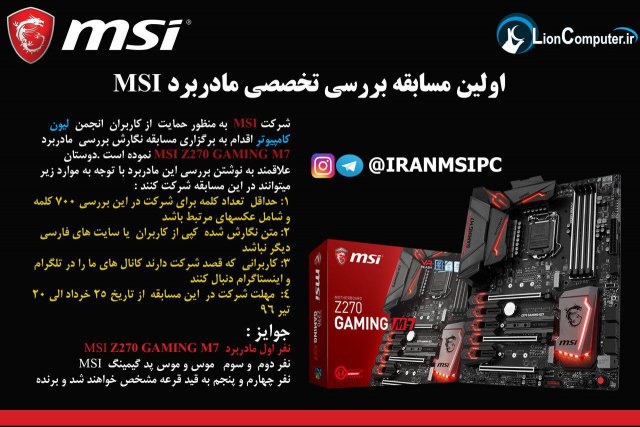شرکت MSI به منظور حمایت از کاربران انجمن لیون کامپیوتر اقدام به برگزاری مسابقه نگارش بررسی مادربرد MSI Z270 GAMING M7 نموده است .دوستان علاقمند به نوشتن بررسی این مادربرد با توجه به موارد زیر میتوانند در این مسابقه شرکت کنند : 1-حداقل تعداد کلمه برای شرکت در این بررسی 700 کلمه و شامل عکسهای مرتبط باشد 2-متن نگارش شده کپی از کاربران یا سایت های فارسی دیگر نباشد 3-کاربرانی که قصد شرکت دارند کانال های ما را در تلگرام و اینستاگرام دنبال کنند 4- مهلت شرکت در این مسابقه 25 روز است جوایز : نفر اول مادربرد MSI Z270 GAMING M7 نفر دوم و سوم موس و موس پد گیمینگ MSI نفر چهارم و پنجم به قید قرعه مشخص خواهند شد و برنده یک موس پد گیمینگ MSI خواهند شد .- 100 ارسال