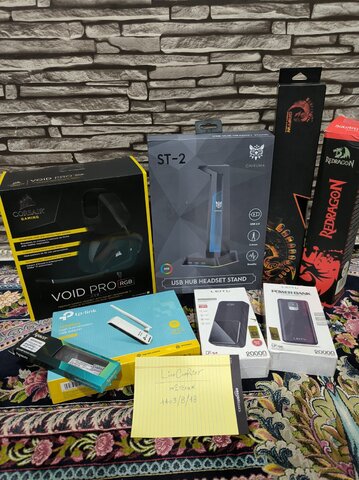فروش تعدای لوازم نکته: فروش همزمان خارج تاپیک پیگیری میشود و هزینه ارسال با خریدار محترم میباشد 1/ رم Apacer 4GB DDR 2400 گارانتی مادام العمر متین 2/هدست گیمینگ Corsair Void Pro USB RGB / صدای 7.1 فوق العاده / هدست بدون استفاده مدتی داخل کارتن نگهداری کردم 3/استند هدست RGB برند Onikuma مدل ST-2 که فوق العاده زیبا و دارای هاب USB در پایه نیز هست (هم استند هدست هم هاب) 4/موس پد گیمینگ عریض Red Dragon با کیفیت و نرم 5/موس پد گیمینگ گرین Griffin با کیفیت و نرم 6/دانگل وای فای TPlink TL-WN722N کاملا در حد نو و خیلی وقته بدون استفاده داخل کارتن نگهداری شده 7/ پاوربانک لیتو مدل LP-56 ظرفیت 20000 گارانتی اصلی پلمپ و آکبند 8/پاوربانک لیتو LP-54 ظرفیت 20000 گارانتی اصلی پلمپ و آکبند قیمت : مورد 1 و 2 و 4 و توافقی مورد 3 و 5 : فروخته شد مورد 6 : 350 مورد 7 : 1200 مورد 8 : 930