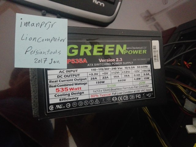 سلام دوستان یک عدد پاور گرین سری GP535A موجوده تمیز و سالم , فقط جهت تمیز کردن و تعویض فن باز شده ./ لینک مشخصات پاور روی سیستمی که همیشه بدون کارت گرافیک بوده و تحت بار خاصی نبوده . تمامی کابل ها و فن سالم . پاور فوق به شرط سلامت کامل و تعمیری نبودن و 24 ساعت تست فروخته می شود ./ قیمت فروش : 55.000 هزینه ارسال به عهده خریدار محترم فروش در فروم همسایه هم برقرار است . یک عدد کیس گرین مگنوم 2 هم موجوده که اون هم به قیمت 50 فروخته می شود . و کولر Thermalright HR-02 Macho Rev.A موجوده به قیمت 100 ./