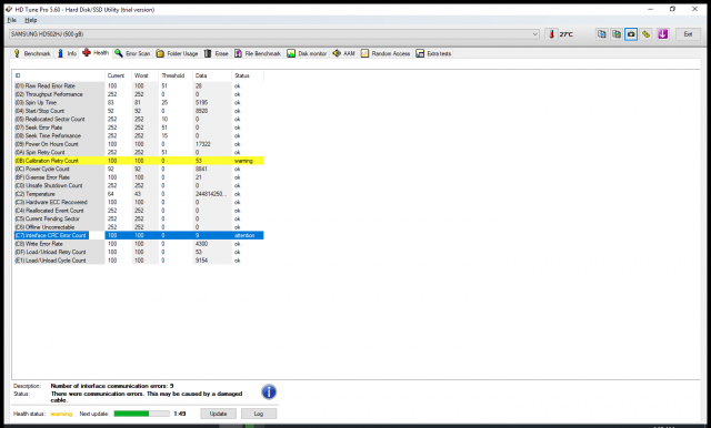 درود برشما عزیزان. دوستان عزیز حدود یکی دو هفته است که هرچی فایل فشرده رو سیستم دانلود می کنم (چه با IDM چه با FDM ) دست آخر تو اکسترکت کردن ارور می دن. دیروز هم چندتا فیلم خواستم دانلود کنم که مثلا تا نصفه میومدن و IDM ارور میداد و دوباره از اول اونو شروع می کرد. تا اینکه بالاخره به هارد دیسکم مشکوک شدم و HD Tune رو باز کردم و با ارور های تصویر زیر رو به رو شدم. به نظرتون این هارد چش شده؟ آِیا آخرای عمرشه ؟ پ.ن: کابل ساتا هارد رو هم تعویض کردم همین چند دقیقه پیش، ارور هارو هنوز نشون میده.