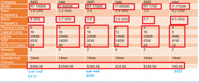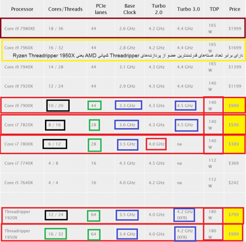 بنام خدا مقایسه سی پی یوi7 نسلSandy Bridge 2تا Coffee Lakeنسل 8 (کافی لیک) ونسل جدید پردازندهKabyLake-X وRyzen Threadrippe شروع می کنم با اجازه اساتید محترم. فقط یه مقداری طولانی است به بزرگواری خودتان ببخشید.سعی دارم با جمع کردن اطلاعات مربوط به cpuوRAm هم در وقت وهم هزینه مالی دوستان کمکی کرده باشم تا برای هر مقایسه کوچک نیازمند ورود به سایت ها خارجی شودند با تشکر از دوستان به خاطر صبور بودن درزمان تکمیل شدن مطلب. خواهشمندنظرات ومطالبی که دراین زمینه به نظرتان می رسد .ارسال کنیدممنون از لطف شما Sandy BridgeتاAMD Ryzen Threadripper بعد از آن شروع طوفانی سریSandy Bridgeبعد از پردازنده قدرتمند سریLynnfield(نسل اول) پردازنده قدرتمندi7-860تاi7-880در سال 2009و2010انتظار می رفت.در نسل بعدی اینتل شاهد عملکرد قابل ملاحضه باشیم.ولی این افزایش قدرت خیلی کم ودر بعضی نرم افزارها وبازی ها خیلی ناچیز بود.از نسل دو تا نسل ششLithographyاز 32nm به 14nm رسیددر ضمن قدرت چیپ گرافیکی داخل پردازنده افزایش پیدا کرد.اما هیچگاه قابل مقایسه حتی با رده پایین AMDوانودیا نبود.تنهانکته دراین زمان چندساله افزایش سرعت درگاههای ارتباطی وافزایش تعدادپورت ارتباطی واضافه شدن درگاههای جدید درپردازنده وچیپ جدید بود. بعد از یک دهه تاخت و تاز شرکت معظم اینتل در بازارپردازنده وعدم ارائه پردازنده قابل قبول توسط شرکت AMD کاربران مجبور بودن به سیاستاستبدادی اینتل تن بدهند وبخاطر تغییر چند صد مگا هرتز ویا یک درگاه جدید پی در یی مادربرد وCPU خود را تعویض کنند.اما خوشبختانه AMD با پردازنده جدیدش توانسته واقعا اینتل را به چالش کشند. شاید اگه اینتل تلاش می کرد . فرکانس پردازنده ها وتعدادهسته مجازی وحقیقی (در یک سوکت ثابت )افزایش می داد خیلی عالی تر بود ودرگاه جدیدتر هم با کارت ها ی که روی اسلات PCI نصب می کرد .کمتر به کاربران خسارت می زد .واین قدر موجب ناراضایت کاربران نمیشود متاسفانه این سیاست استبدای ادامه دارد مثلا در پردازنده I7-8700Kحدود 200مگا هرتز فرکانس بالاتر بود وبرای 200مگاهرتز که در نرم افزار های که بر پایه فرکانس کارایی دارن شاهد تغییر قابل ملاحضه نخواهیم بود فقط یه لطف کرده دوهسته حقیقی ودوهسته مجازی بیشترشده که دراین حالت هم از i7-7800x-i7-8720xعقب تر هست . حتی برای استفاده از این پردازنده علیرغم سوکت 1151باید کاربران مادربردبر پایه چیپ سری 300 خریداری کنند این نتیجه تا سال 2017 اما در آینده سال(2018و2019) اینتل روی پردازنده 10 نانومتری کار می کنند امAMD روی 7 نانومتری کار می کنند. که این هم یکنقطه امیداور کنندهست به امید موفقیت AMD وپایان سلطنت مستبدانه اینتل به نظر بنده بعد از ارائه پردازنده سری i7-8xxxباید منتظر ضربه دیگر از amd بر پیکر اینتل یعنی کاهش قیمت مجدد رایزن باید باشیم. از طرفی اینتل بعدازنسل دوم یعنی نسل سومi7-3770kوچهارمi7-4770kبه علت دستکاری درطلق انتقال حرارتی به علت طمع زیاد اینتل علیرغم افزایش نچندان فرکانس شاهد دمایی غیر قابل کنترل بودیم کاربران مجبور به فن غیر اینتلی مجبور کرد .تا اینکه درنسل هاسول ریفرش مشکل حل شدنسل پنجم سری 5775 پس از تولید به علت مشکلات برنامه ازجمله آفیس دیگر تولید نشودند.ام نسل 6 یا اسکایi7-6700k به سرنوشت ایوبریچ وهاسول گرفتار شدوبار دیگراینتل به دست وپا افتاد تا بالاخره در نسل هفت سری i7-7700k وسایر پردازنده دوباره مشکل برطرف شد .ضعف امنیتی خود مشکل بزرگ بود که از شرکت با این سابق انتظار نداشتیم . انتخاب از میان انبوه محصولات عرضه گشته از جانب کمپانیهای اینتل و AMD به چالشی بزرگ تبدیل میگردد. این مهم حتی در روزهای اخیر و با ورود طوفانی AMD به عرصه رقابت نیز سختتر گشته و بررسی طیف گسترده پردازندههای ارائه شده توسط هر دو کمپانی نامبرده و ویژگیهای قابل پشتیبانی توسط هر کدام از آنها با توجه به گستردگی اطلاعات موجود در سطح اینترنت مدت زمان تقریباً فراوانی را نیازمند میباشد. سعی می کنم بعد از توصیحات مختصر مشخصات پردازنده ها تست ها مختلف از سایت مختلف ( چرا که هر کدام ازسایت ها شاید پارامتری خ