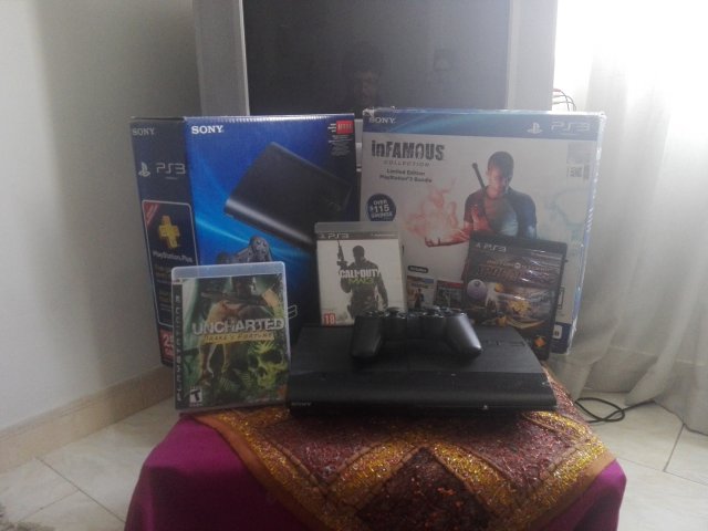 دستگاه باندل است یعنی دارای دو کارتن است حجم هارد 250 گیگ است یک دسته دارد سه بازی اورجینال به صورت دیسک uncharted 1 call of duty modern warfare 3 motor storm دو بازی اورجینال به صورت دیجیتالی Gta v pes 2013 قیمت: 500 مقطوع 09109284335 -