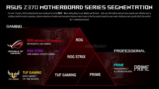 با ورود چیپست های جدید سری 300 کمپانی اینتل و عرضه مادربردهایی مبنی بر این چیپست ،کمپانی ASUS به صورت مجدد ،تقسیم بندی مارک های مختلف در سری مادربردهای خود را انجام داد و هدف از این کار را اجتناب از اشتباه خریداران با محصولاتی مشابه و قیمت بالا و عدم اختلال در انتخاب آنها اعلام کرد.این کمپانی تقسیم بندی محصولات خود را با استفاده از یک هرم مثلث شکل بیان کرد.در پایین این هرم مثلثی شکل سری Prime قرار دارند و جالب تر اینکه سری TUF یا (The Ultimate Force) در این بخش دسته بندی شده اند.سری TUF تاکنون در رده مادربردهای گران قیمت قرار داشته اندزیرا طراحی آنها به صورت بسیار با دوام و مقاومت بالا صورت گرفته است.درحال حاضر این محصولات به قسمت پایین هرم ASUS منتقل شده اند که این بخش مربوط به رده مادربردهای ابتدایی و گیمرهای رده پایین است.در این بردها با توجه به اینکه از قطعات بسیار با کیفیت مانند مدار رگلاتور پردازنده استفاده شده اما در این جدول مورد کم توجهی ASUS قرار گرفته اند. یکی دیگر از نکات قابل توجه این شرکت ، خط تولید سری مادربردهای Prime به عنوان پایه اصلی مادربردهای این شرکت است،که پیش از عرضه مادربردهایی با لوگوی ROG ،وجود دو مادربرد بر پایه چیپست Z370 بر پایه SKU های رده میانی است. اولین نمونه بر این اساس مادربرد Prime Z370-A بوده که مناسب برای فروشگاه ها و مدیران بازاریابی و برای کسانی که امکانات زیاد در کنار کارایی را میخواهند، توصیه شده است. این حرکت همچنین امکان استفاده دیگر SKUها را بر روی سری اول Prime مانند سری "Deluxe" و یا "Premium " رابه پایان میرساند. آخرین و البته بالاترین درجه در این گروه متعلق به سری "Republic of Gamers" یا ROG است،که دارای زیرمجموعه های مشخصی است. زیر مجموعه هایی که لوگوی ROG را با خود یدک میکشند عبارتند از: سری Crosshair (AMD MSDT) ، Maximus (Intel MSDT) ، Rampage (Intel HEDT) و Zenith (AMD HEDT) که بالاترین سطح از این مجموعه را تشکیل داده و برخی نیز نام تجاری Strixرا هم به دنبال خوددارند.البته هر کدام از مادربردهایCrosshair, Maximus, Rampage و Zenith با لوگوی ROG نیز زیرمجموعه هایی را به دنبال خود با کد های "Ranger " "Hero " "Formula " "Impact " "Gene " "Extreme " "Code" و Apex یدک میکشند. سری Strix نیزتنها با اضافه شدن حروف به انتهای نام تجاری متمایز شده اند،مانند نمونه های Strix-E (topmost) و Strix-F (second-best) و Strix-G (micro-ATX) و Strix-H (entry ATX) و Strix-I (mini-ITX) که با توجه به سایز بندی های مختلفی عرضه شده اند.البته در برخی نمونه های این SKU ها ممکن است پسوند "AC" نیز به چشم آید ،که نشان از درگاه ماژول WLAN با پروتکل 802.11ac و یا بلوتوث نسخه های 4 به بالاست. منبع : Techpowerup مترجم : محمد فتحی -