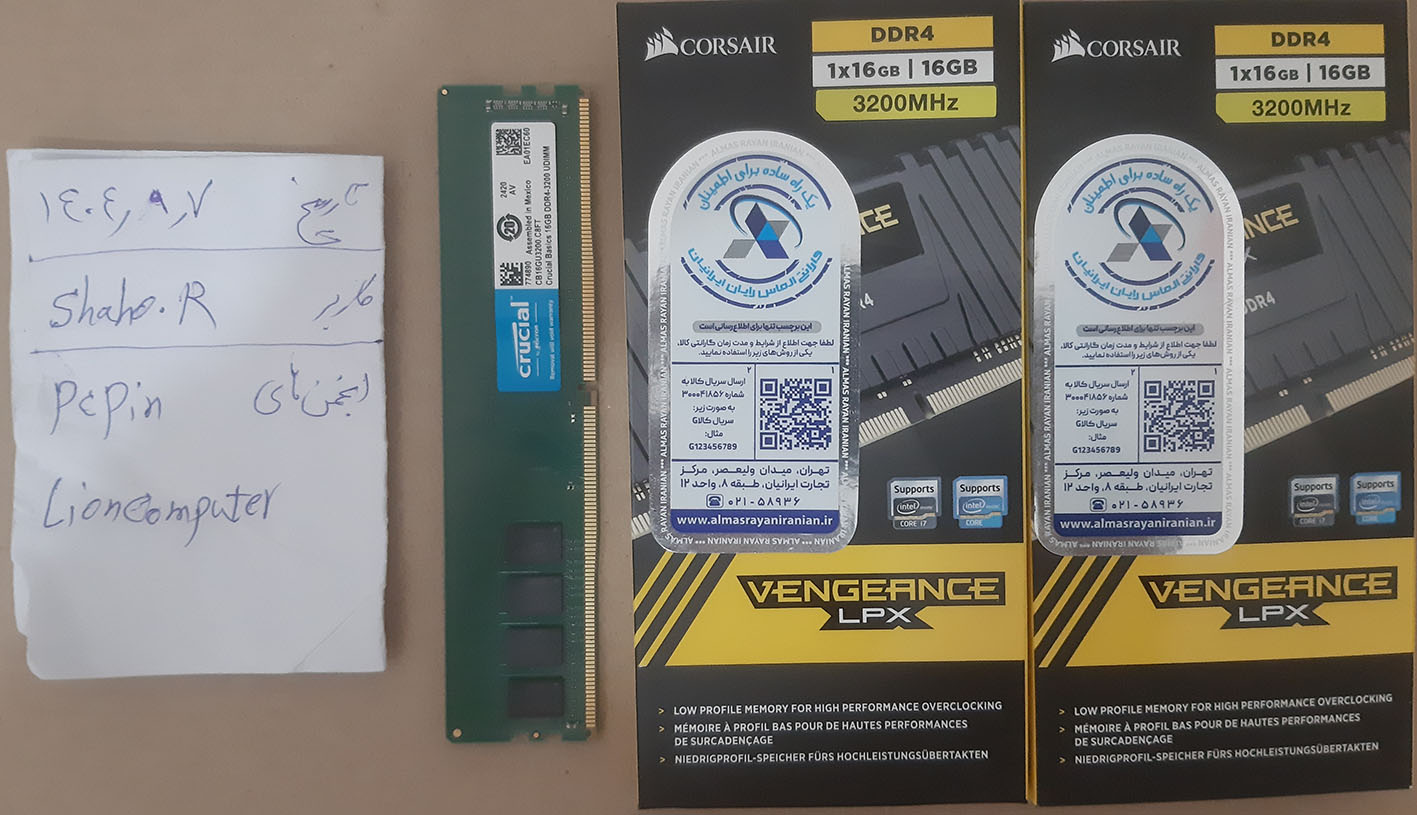 سلام خدمت دوستان تعدادی رم DDR4 برای فروش موجوده مورد اول: Corsair Vengence LPX 3200-16GB تعداد 2 عدد، دارای گارانتی الماس قیمت هر عدد پایه، 6500، گام 100 مورد دوم: Crucial Basics 3200-16GB تعداد 1 عدد قیمت پایه، 5500، گام، 100 پایان مزایده، 24 ساعت بعد از آخرین پیشنهاد بر مبنای پایه هزینه حمل به عهده ی خریدار