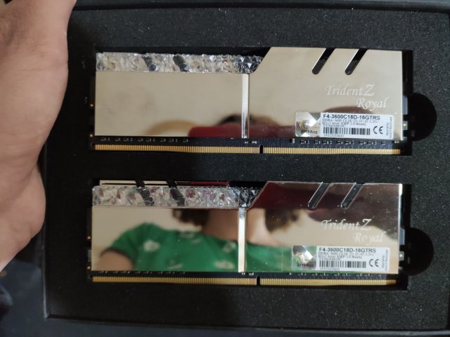 با سلام مدل : Trident Z Royal DDR4-3600MHz CL18-22-22-42 1.35V 16GB (2x8GB) لینک سایت سازنده : https://www.gskill.com/product/165/299/1552461134/F4-3600C18D-16GTRS-Overview رم ها کاملا سالم و کم کارکرد هست با جعبه و گارانتی مادالعمر اماتیس تست memtest86 هم ضمیمه شد روی chipset z270 سی پی یو 6700k یکم غبار و جای اثر انگشت هست توی عکس برای اینه که پاک کردن سطح براقش یکم سخته و دوباره سریع غبار میگیره و ضمنن بخاطر انعکاس نور طلایی بنظر میان ولی نقره ای هستند. قیمت در سایت لیون : 5900 قیمت : 4500 هزینه و مسوولیت پست و واسط به عهده خریدار.- 5 ارسال