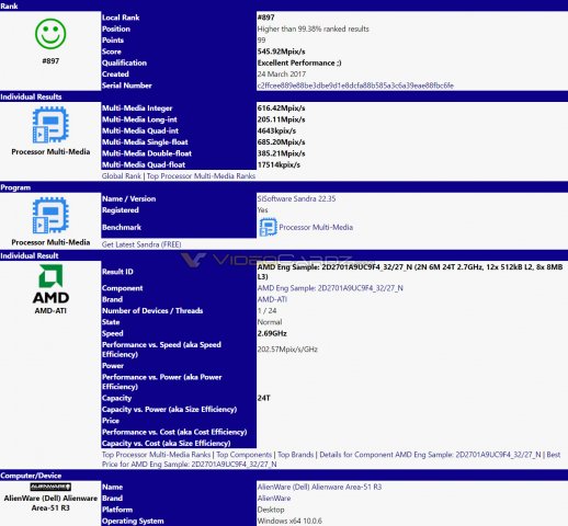 طی گزارشات جدیدی که شاید تأییدی بر اخبار رسیده از قصد AMD به ورود به بازار پردازنده های رده بالای دسکتاپ باشد، به نظر می رسد وجود برخی از چیپ های Ryzen با 12 هسته / 24 رشته بیش از پیش واقعی به نظر می رسند. ایده تولید یک پلتفرم کامل تنها برای یک پردازنده همیشه مضحک به نظر می رسید اما اکنون ظاهراً AMD قصد دارد برای مقابله با پلتفرم X99 و جانشین احتمالی آن، پلتفرم X299 آماده شود. البته به نظر می رسد در نام گذاری برتری با پلتفرم X399 کمپانی AMD است! خود پردازنده یک نمونه مهندسی با کد 2D2701A9UC9F4_32/27_N است که توسط سایت VideoCardz به خوبی این اعداد تشریح شده اند اما در حال حاضر چیزی که مشخص است، این نمونه دارای فرکانس پایه 2.7 گیگاهرتز و فرکانس بوست 3.2 گیگاهرتز است که البته نسبت به یک پردازنده 12 هسته ای کم نیست اما با گزارشات قبلی مبنی بر چیپ های 16 هسته ای AMD با فرکانس پایه 3.1 گیگاهرتز و فرکانس بوست 3.6 گیگاهرتز مقایسه شود، بسیار کمتر شده است. نکته عجیب در این میان مربوط به گزارش نرم افزار راجع به حافظه کش در دسترس است. 8 واحد 8 مگابایتی دو برابر مقداری است که قبلاً گمان می رفت زیرا با توجه به اینکه این پردازنده های 12 هسته ای دارای Dieهایی با 3 واحد CCX با 8 مگابایت کش هستند که هر کدام 4 هسته دارند، بنابراین می توان نتیجه گرفت 3 واحد CCX مساوی با 3 واحد 8 مگابایتی خواهد بود و نه 8 واحد 8 مگابایتی! با این حال ممکن است این خطا مربوط به وجود باگی در نرم افزار باشد زیرا این چیپ هنوز در مرحله نمونه مهندسی می باشد. منبع: TechPowerUp مترجم: مجید بکائیان -